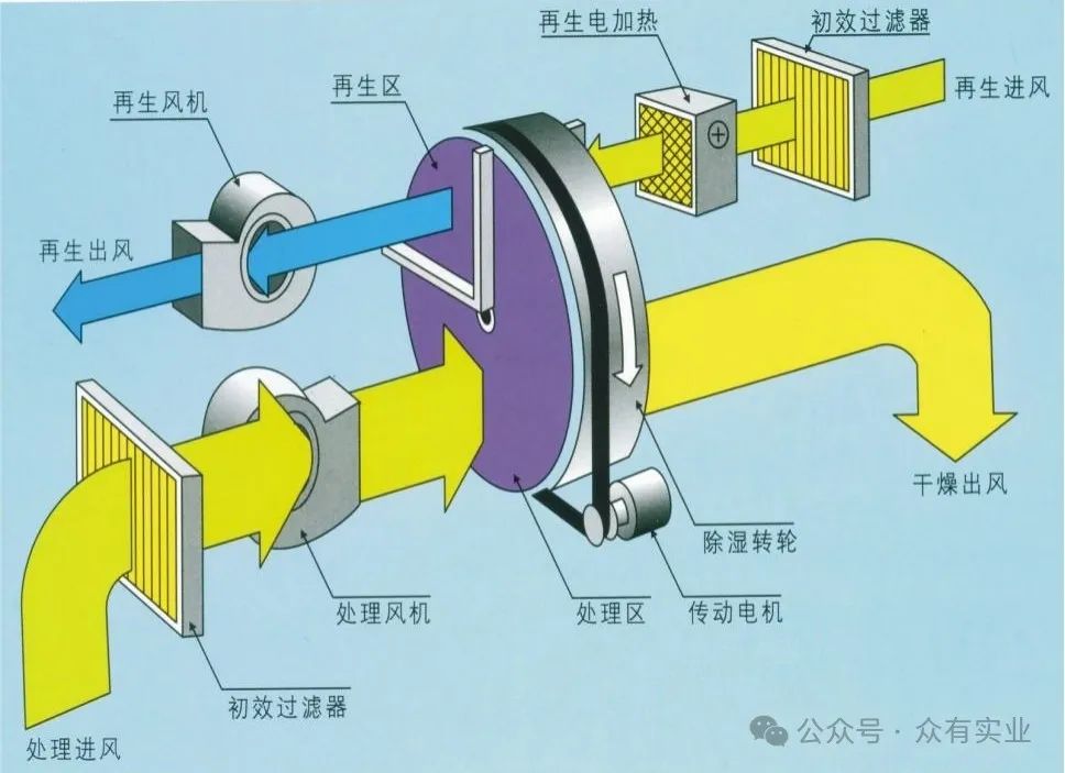 轉(zhuǎn)輪除濕機(jī)通常有兩個(gè)風(fēng)路:處理風(fēng)(干空氣)和再生風(fēng)(濕空氣)。處理風(fēng)是需要被除濕的空氣,再生風(fēng)是用于再生吸濕輪的空氣。
