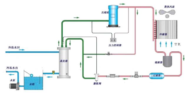 當(dāng)空氣冷卻式制冷機(jī)啟動(dòng)時(shí),制冷劑吸收蒸發(fā)器中被冷卻物體的熱量并蒸發(fā)。壓縮機(jī)不斷地從蒸發(fā)器中提取產(chǎn)生的氣體,并將其壓縮成高溫高壓蒸汽。然后,制冷劑蒸汽被送往冷凝器,在那里與空氣進(jìn)行熱交換。釋放熱量后,它凝結(jié)成液體。液體制冷劑在被膨脹閥減壓后,進(jìn)入蒸發(fā)器,在那里再次蒸發(fā),吸收冷卻物體的熱量。重復(fù)該熱交換過程,直到工業(yè)用水冷卻到所需溫度。